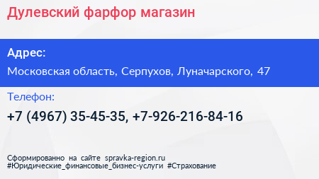 Дулевский фарфор, магазин по адресу Московская область, Серпухов, Луначарского, 47 в дальнейшем Организация, размещена в следующих категориях: