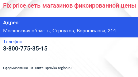 Fix price, сеть магазинов фиксированной цены по адресу Московская область, Серпухов, Ворошилова, 214 в дальнейшем Организация, размещена в следующих категориях: