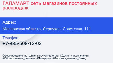 ГАЛАМАРТ, сеть магазинов постоянных распродаж по адресу Московская область, Серпухов, Советская, 111 в дальнейшем Организация, размещена в следующих категориях: