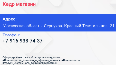 Кедр, магазин по адресу Московская область, Серпухов, Красный Текстильщик, 21 в дальнейшем Организация, размещена в следующих категориях: