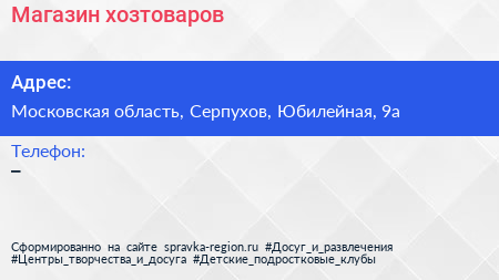 Магазин хозтоваров по адресу Московская область, Серпухов, Юбилейная, 9а в дальнейшем Организация, размещена в следующих категориях: