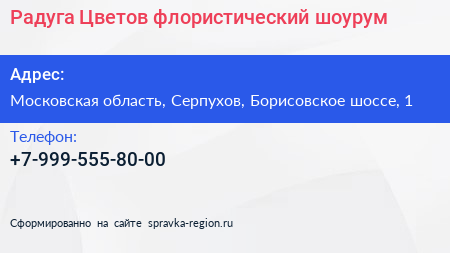 Радуга Цветов, флористический шоурум по адресу Московская область, Серпухов, Борисовское шоссе, 1 в дальнейшем Организация, размещена в следующих категориях:
