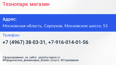 Технопарк, магазин по адресу Московская область, Серпухов, Московское шоссе, 53 в дальнейшем Организация, размещена в следующих категориях: