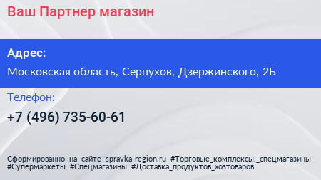 Ваш Партнер, магазин по адресу Московская область, Серпухов, Дзержинского, 2Б в дальнейшем Организация, размещена в следующих категориях: