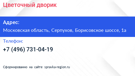 Цветочный дворик по адресу Московская область, Серпухов, Борисовское шоссе, 1а в дальнейшем Организация, размещена в следующих категориях: