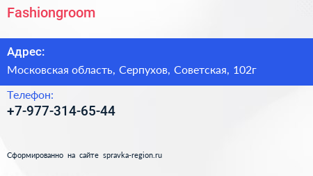 Fashiongroom по адресу Московская область, Серпухов, Советская, 102г в дальнейшем Организация, размещена в следующих категориях: