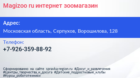 Magizoo.ru, интернет-зоомагазин по адресу Московская область, Серпухов, Ворошилова, 128 в дальнейшем Организация, размещена в следующих категориях: