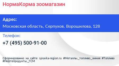НормаКорма, зоомагазин по адресу Московская область, Серпухов, Ворошилова, 128 в дальнейшем Организация, размещена в следующих категориях: