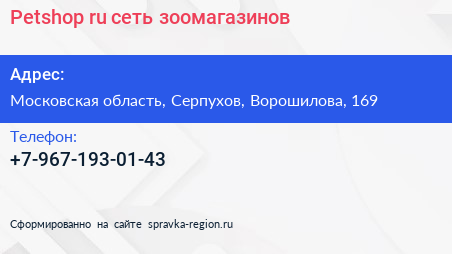 Petshop.ru, сеть зоомагазинов по адресу Московская область, Серпухов, Ворошилова, 169 в дальнейшем Организация, размещена в следующих категориях: