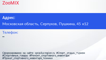 ZooMIX по адресу Московская область, Серпухов, Пушкина, 45 к12 в дальнейшем Организация, размещена в следующих категориях: