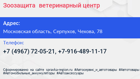 Зоозащита+, ветеринарный центр по адресу Московская область, Серпухов, Чехова, 78 в дальнейшем Организация, размещена в следующих категориях: