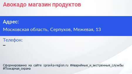 Авокадо, магазин продуктов по адресу Московская область, Серпухов, Межевая, 13 в дальнейшем Организация, размещена в следующих категориях: