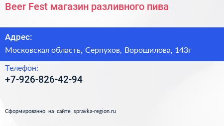 Beer Fest, магазин разливного пива по адресу Московская область, Серпухов, Ворошилова, 143г в дальнейшем Организация, размещена в следующих категориях: