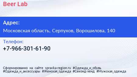 Beer Lab по адресу Московская область, Серпухов, Ворошилова, 140 в дальнейшем Организация, размещена в следующих категориях: