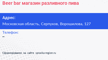 Beer bar, магазин разливного пива по адресу Московская область, Серпухов, Ворошилова, 127 в дальнейшем Организация, размещена в следующих категориях: