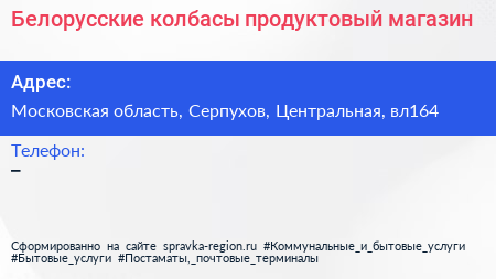 Белорусские колбасы, продуктовый магазин по адресу Московская область, Серпухов, Центральная, вл164 в дальнейшем Организация, размещена в следующих категориях: