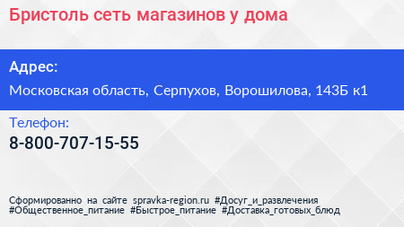 Бристоль, сеть магазинов у дома по адресу Московская область, Серпухов, Ворошилова, 143Б к1 в дальнейшем Организация, размещена в следующих категориях: