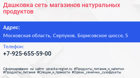 Дашковка, сеть магазинов натуральных продуктов по адресу Московская область, Серпухов, Борисовское шоссе, 5 в дальнейшем Организация, размещена в следующих категориях: