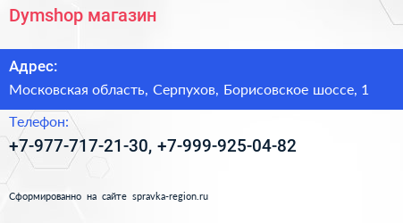 Dymshop, магазин по адресу Московская область, Серпухов, Борисовское шоссе, 1 в дальнейшем Организация, размещена в следующих категориях: