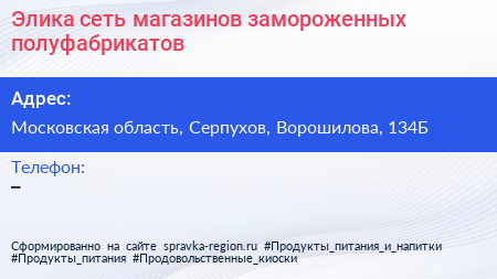Элика, сеть магазинов замороженных полуфабрикатов по адресу Московская область, Серпухов, Ворошилова, 134Б в дальнейшем Организация, размещена в следующих категориях: