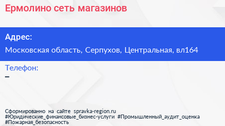 Ермолино, сеть магазинов по адресу Московская область, Серпухов, Центральная, вл164 в дальнейшем Организация, размещена в следующих категориях: