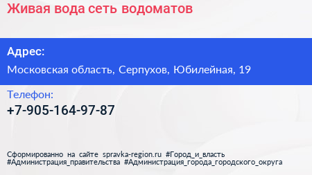 Живая вода, сеть водоматов по адресу Московская область, Серпухов, Юбилейная, 19 в дальнейшем Организация, размещена в следующих категориях: