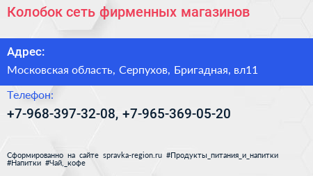 Колобок, сеть фирменных магазинов по адресу Московская область, Серпухов, Бригадная, вл11 в дальнейшем Организация, размещена в следующих категориях: