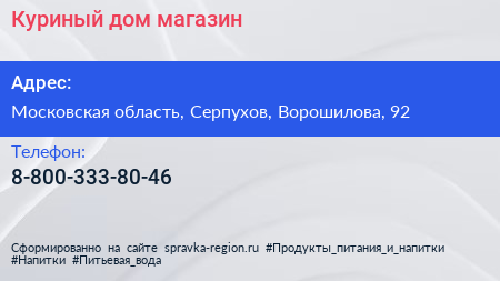 Куриный дом, магазин по адресу Московская область, Серпухов, Ворошилова, 92 в дальнейшем Организация, размещена в следующих категориях: