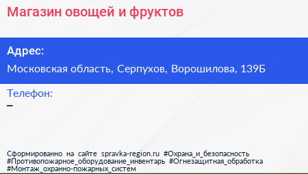 Магазин овощей и фруктов по адресу Московская область, Серпухов, Ворошилова, 139Б в дальнейшем Организация, размещена в следующих категориях: