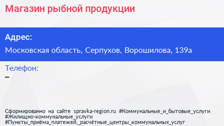 Магазин рыбной продукции по адресу Московская область, Серпухов, Ворошилова, 139а в дальнейшем Организация, размещена в следующих категориях:
