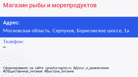 Магазин рыбы и морепродуктов по адресу Московская область, Серпухов, Борисовское шоссе, 1а в дальнейшем Организация, размещена в следующих категориях: