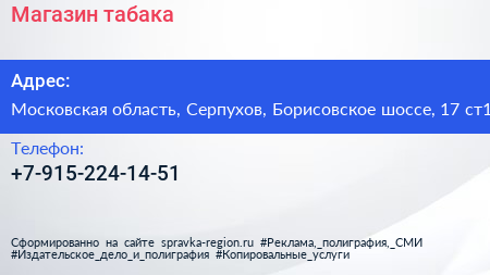 Магазин табака по адресу Московская область, Серпухов, Борисовское шоссе, 17 ст1 в дальнейшем Организация, размещена в следующих категориях: