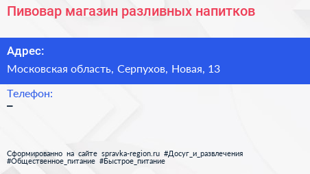 #Пивовар, магазин разливных напитков по адресу Московская область, Серпухов, Новая, 13 в дальнейшем Организация, размещена в следующих категориях: