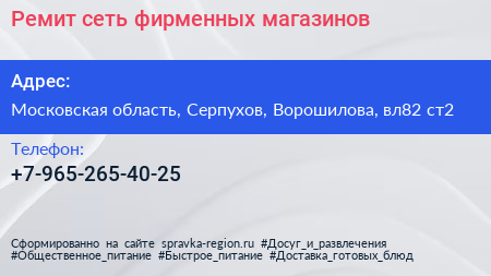 Ремит, сеть фирменных магазинов по адресу Московская область, Серпухов, Ворошилова, вл82 ст2 в дальнейшем Организация, размещена в следующих категориях: