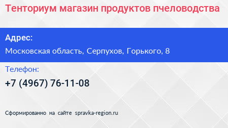 Тенториум, магазин продуктов пчеловодства по адресу Московская область, Серпухов, Горького, 8 в дальнейшем Организация, размещена в следующих категориях: