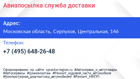 Авиапосылка, служба доставки по адресу Московская область, Серпухов, Центральная, 146 в дальнейшем Организация, размещена в следующих категориях: