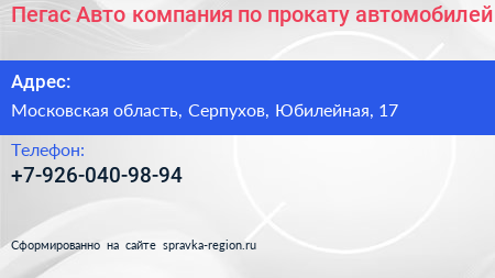 Пегас-Авто, компания по прокату автомобилей по адресу Московская область, Серпухов, Юбилейная, 17 в дальнейшем Организация, размещена в следующих категориях: