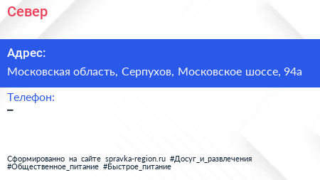 Север по адресу Московская область, Серпухов, Московское шоссе, 94а в дальнейшем Организация, размещена в следующих категориях: