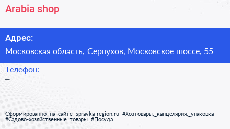Arabia shop по адресу Московская область, Серпухов, Московское шоссе, 55 в дальнейшем Организация, размещена в следующих категориях: