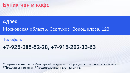 Бутик чая и кофе по адресу Московская область, Серпухов, Ворошилова, 128 в дальнейшем Организация, размещена в следующих категориях: