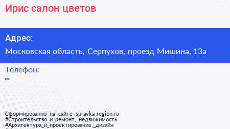 Ирис, салон цветов по адресу Московская область, Серпухов, проезд Мишина, 13а в дальнейшем Организация, размещена в следующих категориях: