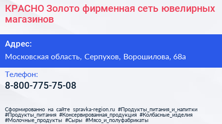 КРАСНО Золото, фирменная сеть ювелирных магазинов по адресу Московская область, Серпухов, Ворошилова, 68а в дальнейшем Организация, размещена в следующих категориях: