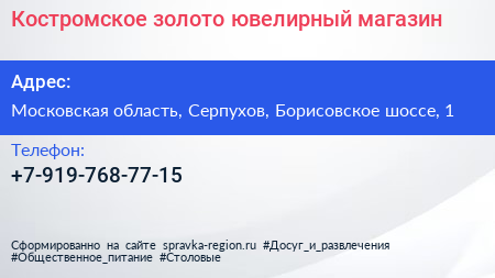 Костромское золото, ювелирный магазин по адресу Московская область, Серпухов, Борисовское шоссе, 1 в дальнейшем Организация, размещена в следующих категориях: