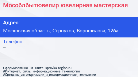 Мособлбытювелир, ювелирная мастерская по адресу Московская область, Серпухов, Ворошилова, 126а в дальнейшем Организация, размещена в следующих категориях: