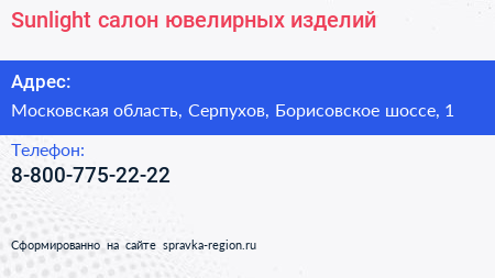 Sunlight, салон ювелирных изделий по адресу Московская область, Серпухов, Борисовское шоссе, 1 в дальнейшем Организация, размещена в следующих категориях: