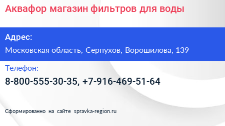 Аквафор, магазин фильтров для воды по адресу Московская область, Серпухов, Ворошилова, 139 в дальнейшем Организация, размещена в следующих категориях: