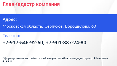ГлавКадастр, компания по адресу Московская область, Серпухов, Ворошилова, 60 в дальнейшем Организация, размещена в следующих категориях: