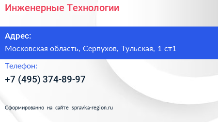 Инженерные Технологии по адресу Московская область, Серпухов, Тульская, 1 ст1 в дальнейшем Организация, размещена в следующих категориях: