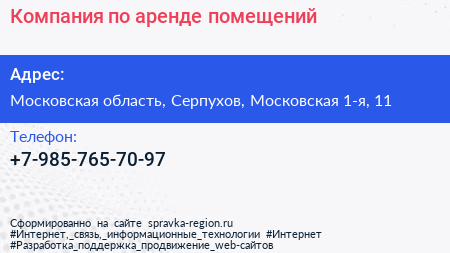 Компания по аренде помещений по адресу Московская область, Серпухов, Московская 1-я, 11 в дальнейшем Организация, размещена в следующих категориях: