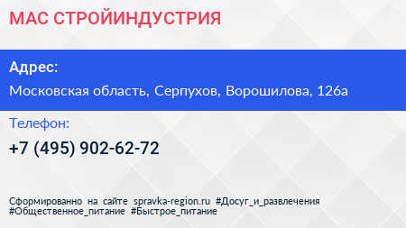 МАС СТРОЙИНДУСТРИЯ по адресу Московская область, Серпухов, Ворошилова, 126а в дальнейшем Организация, размещена в следующих категориях: